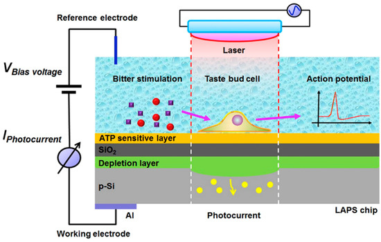 In recent years, some new bitter taste transduction mechanisms have been reported and significantly promoted for cell-based taste sensor development [118,119,120]. Among them, a calcium-induced release mechanism has attracted most interest. When bitter substances first bind to bitter receptors on cell membranes, the heterotrimeric G protein is activated and triggers the release of two intracellular messengers, resulting in an increase in the intracellular Ca2+ concentration, followed by a depolarization of the plasma membrane to generate action potentials [121]. Inspired by this mechanism, researchers have built a series of bitter taste biosensors with different cell lines. In addition to taste bud cells from human tongues, many other cells expressing bitter taste receptors, such as HEK-293 cells [122], human Caco-2 cells [123], rat germ cells [124], and rat cardiomyocytes [125], have been considered as the sensing elements to improve the taste discrimination ability of bitterness biosensors. For instance, Du et al. fabricated a bitter taste biosensor by culturing taste bud cells on a LAPS, which was a photoelectric semiconductor and sensitive to surface potential changes, and then achieved the bitter detection based on a single taste cell [126]. Meanwhile, according to the bitterness-sensing mechanism of a taste bud cell where the ATP was released from cells with accompanying Ca2+ release, these researchers modified the LAPS surface with an ATP-sensitive DNA aptamer to measure the ATP release from the cells simultaneously, endowing the biosensor with the ability to record signal changes in both discrete and continuous modes (as shown in Figure 5). Upon adding the bitter denatonium, the cell membrane potential changes were coupled to the bias voltage supplied on the LAPS and then generated a corresponding fluctuation photocurrent. Additionally, the released ATP from illuminated taste cells could bind with the DNA aptamer on the surface of LAPS, which caused the surface charge changes and the modulation of the flat-band potential. This biosensor provided the possibility to record the taste signal transduction at the single-cell level.