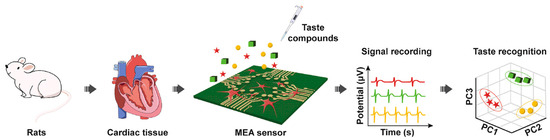 Schematic diagram of biosensor construction and bitter taste detection with rat cardiomyocytes on an MEA sensor chip. Reproduced from [109] with permission from Elsevier.