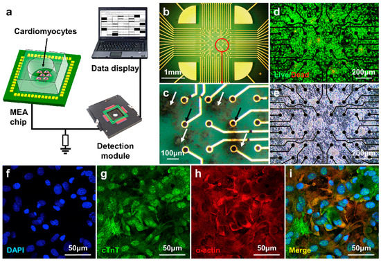 The cell culture results of cardiomyocytes on the MEA sensor. (a) Schematic diagram of the taste sensor system based on MEA sensor; (b–e) staining and optical micrographs of cardiomyocytes on MEA sensor; (f–i) immunofluorescence staining results for the nuclei (DAPI, blue), cardiac troponin T (cTnT, green), and α-actinin (red) in cardiomyocytes and the merged image. Reproduced from [108] with permission from Elsevier.