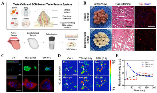 Preparation and sensing performance evaluation of TEM-based artificial tongue. (A) Schematic image of taste cell- and TEM-based taste sensing systems; (B) characterization of tongue tissue matrix before and after decellularization; (C) immunostaining of taste cell-specific markers, gustducin (green) and PLC-β2 (red), on Col. I-based and TEM-coated 2D platform; (D) changes in calcium ion flux imaging of taste cells after treating with bitter compound saccharin; (E) imaging analysis of taste cells’ sensing performance. Reproduced from [129] with permission from Elsevier.