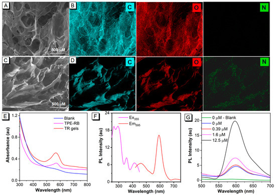 Characterizations of TR hydrogels. (A,C) SEM images and (B,D) EDX elemental-mapping images of agarose hydrogels and TR hydrogels. (E) UV-vis absorption spectra of agarose hydrogels, TPE-RB and TR hydrogels. (F) Excitation (Ex) and emission (Em) spectra of TR-FC hydrogel. (G) Fluorescent response of TR hydrogels in the presence of different concentrations of Hg2+. The blank represents pure-agarose hydrogels and the concentration of TPE-RB in TR hydrogels is 15 μM.