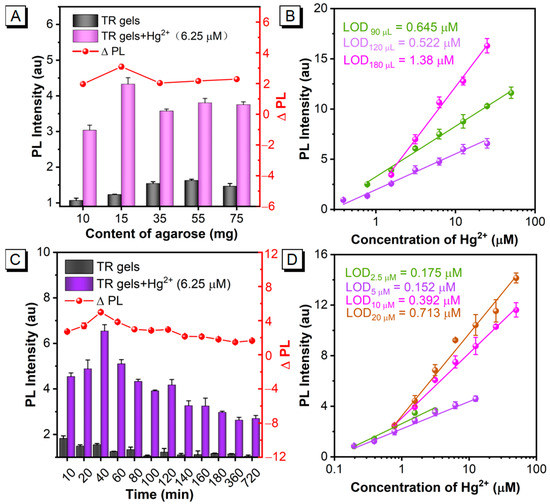 To obtain the best detection performance of AIEgen-encapsulated hydrogel probes for Hg2+, several key parameters that could affect the sensing sensitivity were systematically explored and optimized, including the agarose content, hydrogel volume, reaction time and TPE-RB concentration. The agarose content in the reaction system was first optimized, since the aperture of agarose gel depends on the agarose concentration. As shown in Figure 2A, with the amount of agarose increasing from 10 mg to 75 mg, the background emission of the encapsulated hydrogels gradually increased, which may be due to the denser cross-linking network and smaller pores of the prepared hydrogels at the high agarose content, thus restricting the intramolecular motion of the TPE unit for high DTBET efficiency of the rhodamine moiety. Notably, after reacting with Hg2+ (6.25 μM), the high PL intensity with the maximum PL intensity difference (ΔPL) of the TR hydrogels was obtained when the agarose content was 15 mg. The possible reason is that the hydrogel probes with 10 mg of agarose present a limited confinement effect due to the relatively sparse network, while the TR hydrogels with the agarose feeding amount higher than 35 mg possess dense cross-linking networks and a lower water content, which may hinder the enrichment and dispersion of Hg2+ in the gel, resulting in lower ΔPL. Alongside that, we also found that the agarose solution could not be solidified into a complete hydrogel when the agarose content was less than 10 mg in the system, and the hydrogel formation speed was too rapid to blend well with the TPE-RB dyes to form the TR hydrogels when the agarose content was higher than 80 mg.