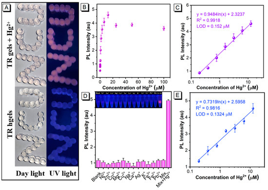 For the detection of Hg2+, one piece of TR hydrogel was placed into 1.5 mL centrifuge tube containing 1 mL of standard solutions spiked with different Hg2+ concentrations, from 0 to 100 μM. After reacting for 40 min, the PL intensity of the reacted TR hydrogels was recorded at 595 nm using the Thermo Scientific Varioskan LUX multimode reader, under an excitation wavelength of 355 nm.