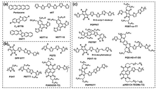 In comparison with inorganic semiconductor materials, organic semiconductor (OSC) materials have the following three advantages: (1) desired properties and functions can be obtained by simple chemical modification; (2) OSCs can be dissolved in common solvents to prepare devices by solution process methods such as spin coating and drop casting instead of the traditional vacuum deposition method, and it greatly simplifies the process of device preparation and decreases the cost; (3) there are many kinds of OSCs with good flexibility for integrating circuits and flexible displays. According to the molecular weight of the OSC materials, they can be divided into small molecule materials and polymer materials. The chemical structures of some typical OSC materials are shown in Figure 7.