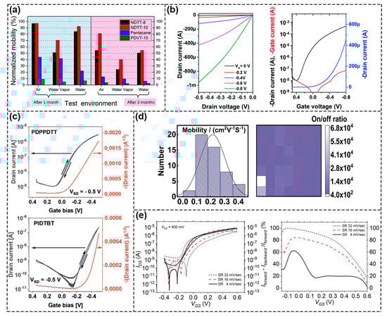 Performance of semiconductors used in FET Biosensors. (a) Stability testof NDTT–8 and NDTT–10 in water environment. Reproduced with permission from [67]. Copyright 2019, The Royal Society of Chemistry. (b) Characteristic I–V curves of PQD–HD–4T–DD polymer in water environments. Reproduced with permission from [69]. Copyright 2020, The Royal Society of Chemistry. (c) Representation of characteristic curves of PDPPDTT and PIDTBT transistors. Reproduced with permission from [70]. Copyright 2021, Wiley–VCH GmbH. (d) Saturation mobility and on/off ratio of PDBT–co–TT polymer transistors. Reproduced with permission from [71]. Copyright 2020, Elsevier B.V. I. (e) Characteristic I–V curves of N–type polymers, p(NDI–C4–TEGMe–T2). Reproduced with permission from [72]. Copyright 2022, Wiley–VCH GmbH.