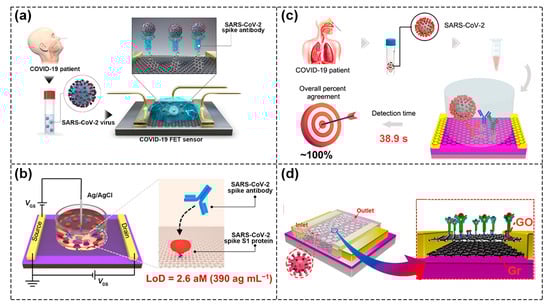 Seo et al. reported on a FET biosensor for detecting SARS–CoV–2 virus in clinical samples, in which the SARS–CoV–2 spike antibody was coupled with a graphene sheet and used as sensing area (Figure 9a). It was able to detect SARS–CoV–2 spike protein in the clinical transport medium of 100 fg/mL [76]. Wei’s group also developed a GFET biosensor modified with spike S1 protein (Figure 9b). Through the specific binding of SARS–CoV–2 antibody and S1, the conductance in graphene channels changed, and the ultra–low detection limit of SARS–CoV–2 antibody reached 2.6 aM [1]. The research group also tried to use DNA probes as recognition elements; however, conventional flexible SS DNA probes would aggregate and entangle at the sensing interface of conductive channels, leading to the inactivation of SS DNA probes, thus researchers used GFET and Y–shaped DNA dual probes (Y–dual probes) to detect SARS–CoV–2 nucleic acid. Due to the synergistic effect of probe sites targeting the ORF1ab and N gene regions, the biosensor had a high recognition rate for SARS–CoV–2 nucleic acid and reached a detection limit of three copies in 100 μL solution [77]. At present, most research on biological target analytes is focused on proteins including antigens, enzymes, etc., which are generally detected directly without an amplification process, leading to less accuracy than polymerase chain reaction (PCR). As shown in Figure 9c, Wei et al. demonstrated a multi–antibody FET sensor and successfully detected SARS–CoV–2 in artificial saliva with a detection limit of 3.5 × 10−17 g/mL and a detection limit of 0.173copies μL−1 in nasopharyngeal swabs [78]. In Figure 9d, Gao et al. fabricated biosensors using a van der Waals heterostructure of graphene and graphene oxide (GO) [79]. Compared with the GFET biosensor, the sensitivity for SARS–CoV–2 protein detection of the biosensors with GO/Gr heterostructure was increased threefold. This was mainly due to the fact that GO formed a uniform protective layer, which could prevent external ions from directly contacting the surface of graphene. At the same time, due to the formation of heterojunctions, the efficiency of electron exchange was improved through interface coupling and the charge mobility of the device was further improved. The advantage of 2D–layered materials is that they can be further integrated with other materials to form a special heterojunction at the atomic scale, which opens up new opportunities for constructing new biosensor components.