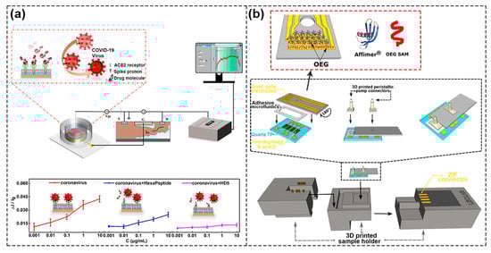 Schematic of integrated FET biosensors with microfluidic for lab–on–chip. (a) Schematic of biosensor chip modified by SLB (top) and the inhibitory response of two different drugs to the interaction between coronavirus and ACE2 receptor (bottom). Reproduced with permission from [89]. Copyright 2022, American Chemical Society. (b) Schematic of a lab–on–chip multi–gates organic transistor based on 3Dprinting and modified multi–gates in the red dotted box. Reproduced with permission from [91]. Copyright 2020, American Chemical Society.