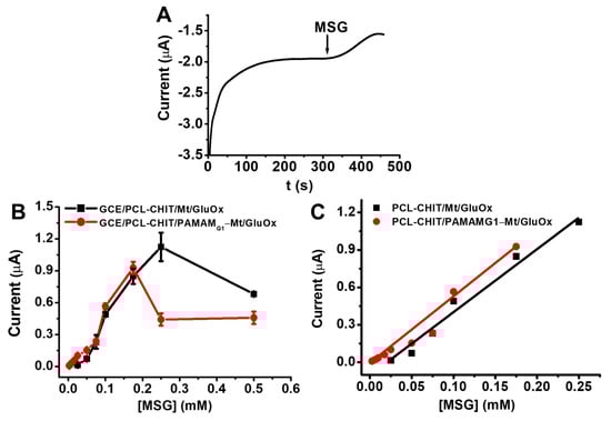 3.3. PCL–CHIT/PAMAMG1–Mt/GluOx for MSG Detection