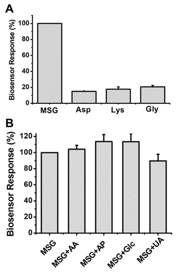 - Mentana, A.; Nardiello, D.; Palermo, C.; Centonze, D. Accurate Glutamate Monitoring in Foodstuffs by a Sensitive and Interference-Free Glutamate Oxidase Based Disposable Amperometric Biosensor. Anal. Chim. Acta 2020, 1115, 16–22. [Google Scholar] [CrossRef] [PubMed]