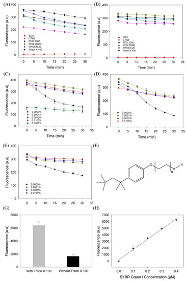We first screened a few surfactants and polymers [28]. The basic properties of these surfactants are listed in Table 2. Initially, the fluorescence readings of all surfactant samples were between 200 and 400 fluorescence units (FU) (Figure 3A,B) using both the plate and cuvette, except for SDS (close to 0) and CTAB (lower fluorescence). SDS is an anionic surfactant. We hypothesized that SDS may compete with the aptamer for SGI, resulting in a very weak fluorescence signal. Cationic CTAB may compete with SGI for binding with the DNA. The hydrophilic–lipophilic balance (HLB) values of Triton X-100, CTAB, and SDS are 13.5, 21.4, and 40, respectively [29]. These three surfactants have strong hydrophilicity and weak lipophilic interactions. They mainly bind to DNA and dyes through cation/anion interactions. The data shows that Triton X-100 had the most prominent stabilizing effect on the fluorescence intensity of the DNA-SGI system. Triton X-100 is a non-ionic surfactant (Figure 3F), and thus, the absence of electrostatic interactions with DNA or dye may contribute to its good stabilizing effect.