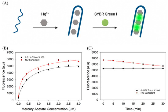 The effect of surfactants on the binding of Hg2+ by T30 DNA was evaluated using a 96-well black plate (Corning) in Buffer 2 containing 200 nM T30 aptamer, 0.1× SGI, and 0% or 0.01% Triton X-100. The sample solution (100 µL) was titrated with mercury acetate up to a final concentration of 3 µM. Fluorescence intensity was monitored using a Tecan Spark plate reader at 488 nm excitation and 532 nm emission. For signal stability measurement, 100 µL of sample solution contained 200 nM T30 aptamer, 0.1× SGI, 2 µM mercury acetate, and 0% or 0.01% Triton X-100 in Buffer 2. Fluorescence intensity was monitored using the microplate reader with 488 nm excitation and 532 nm emission for 30 min.