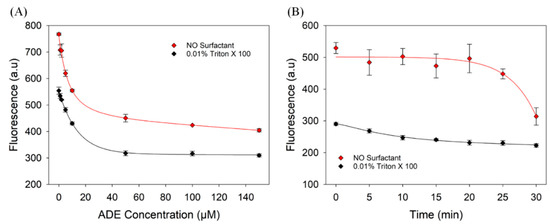 The effect of surfactants on the binding of adenosine by its aptamer was evaluated using a 96-well black (Corning) plate in Buffer 1 containing 1 µM aptamer, 1 µM ThT, and 0% or 0.01% Triton X-100. The sample solution (100 µL) was titrated with adenosine up to a final concentration of 150 µM. Fluorescence intensity was monitored using the microplate reader at 488 nm excitation and 532 nm emission. For signal stability measurement, 100 µL of sample solution contained, 1 µM aptamer, 100 µM adenosine, 1 µM ThT, and 0% or 0.01% Triton X-100 in Buffer 1. Fluorescence intensity was monitored using the microplate reader with 488 nm excitation and 532 nm emission for 30 min.