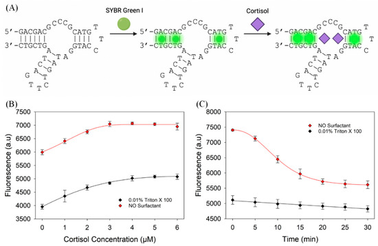 (A) The scheme of cortisol binding to its aptamer detected by SYBR Green I. Initially, the combination of SGI and aptamer produces weak fluorescence, and after the addition of cortisol, aptamer–cortisol binding results in enhanced fluorescence. (B) Titration curve of 1 µM CSS.1-42 with cortisol with and without Triton X-100. (C) Effect of Triton X-100 on signal stability of CSS.1-42 Apt-SGI-cortisol titration.
