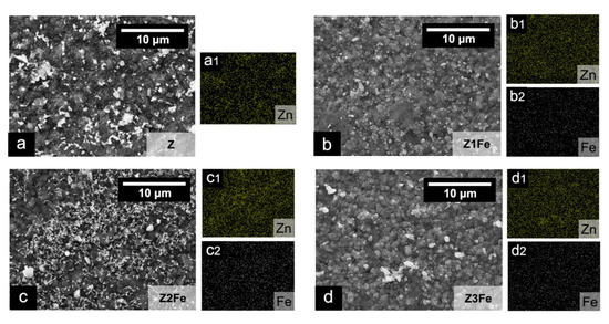 EDX mapping of zinc and iron in thin films of ZnO/Fe2O3: (a) Z, (b) Z1Fe, (c) Z2Fe, and (d) Z3Fe with Zn and Fe element distribution (a1–d2).