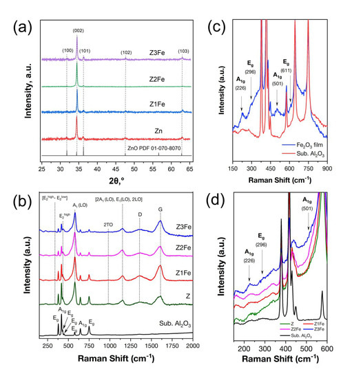 Additionally, synthesized ZnO/Fe2O3 thin films on Al2O3 substrates were studied by Raman spectroscopy. As can be seen from Figure 3b, besides the peaks related to the α-Al2O3 substrate (A1g at 418 and 644 cm−1 and Eg at 378, 430, 450, 576 and 749 cm−1) [45], an intense ZnO peak at 577 cm−1, corresponding to A1(LO) mode, is observed in all samples. In addition, peaks assigned to the (E2high–E2low), E2high, 2TO, and [2A1 (LO), E1(LO), 2LO] modes were observed at 332, 438, 982, and 1153 cm−1, respectively [46]. Two peaks at 1356 and 1607 cm−1 can be attributed to the D- and G-bands of residual carbon that remained after the synthesis. Figure 3c shows the spectrum of the individual iron oxide film. As can be seen, besides the α-Al2O3 substrate peaks, bands at 226, 501 (A1g) and 296 (Eg) cm−1 with low intensity, characteristic of α-Fe2O3 (trigonal syngony, hematite phase, space group R3c), are observed [47]. Figure 3d shows that the α-Fe2O3 peaks at 226 and 296 cm−1 in the spectra of Z1Fe, Z2Fe, and Z3Fe samples are also low in intensity. The weak signal from α-Fe2O3 may indicate the low concentration and thickness of the iron oxide layer. Slightly more intense peaks are observed for the Z3Fe sample due to the higher concentration of iron oxide. The obtained peaks related to Fe2O3, although low-intensity, allow us to establish the formation of the ZnO/α-Fe2O3 nanocomposite.