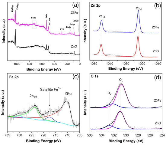 Figure 4a shows an overview XPS spectrum of Z and Z3Fe samples. As can be seen, the spectrum contains signals of the element peaks: Zn, O, and C (for the sample ZnO), as well as weakly intense signals from Fe (for the sample Z3Fe). It is likely that carbon is in the composition of CO2 sorbed on the surface of the materials, as well as residual products after the synthesis. Figure 4b shows the XPS spectra of Zn 2p. Two peaks of Zn 2p1/2 and Zn 2p3/2 can be seen on the plot: at 1045.4 and 1022.3 eV, 1045.2 and 1022.1 eV for ZnO, and Z3Fe samples, respectively. The spin-orbit splitting was 23.1 eV, which is typical for ZnO with the wurtzite structure and agrees well with the literature data [48,49].