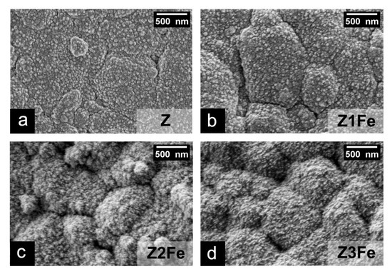 The microstructure and dispersity of ZnO/Fe2O3 thin films on Al2O3 substrates were studied by scanning electron microscopy (SEM). As can be seen (Figure 5), all films uniformly cover the substrate surface, forming a continuous coating. The lower layer of ZnO in all films consists of spherical nanoparticles. In sample Z, the size of ZnO nanoparticles is 66 ± 13 nm, Z1Fe: 50 ± 14 nm, and Z2Fe: 51 ± 10 nm, and, in Z3Fe, the iron oxide covers the ZnO particles tightly, due to which it is not possible to calculate their size. The data obtained correlate well with the calculated crystallite values estimated using the Scherrer method on the obtained X-ray diffraction patterns. Z2Fe and Z3Fe samples show Fe2O3 nanoparticles on the ZnO surface, their size in the Z2Fe sample being 23 ± 4 nm, and, with increasing sputtering time (Z3Fe), their size increases to 28 ± 5 nm. Due to the low concentration of iron in the Z1Fe sample, it is not possible to estimate the size of Fe2O3 nanoparticles.