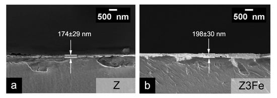 Figure 6 shows microphotographs of chips of glass substrates with Z(a) and Z3Fe (b) films applied. The calculated film thickness values for Z, Z1Fe, Z2FE, and Z3Fe were 174 ± 29, 181 ± 11, 185 ± 40, and 198 ± 30 nm, respectively Thus, the thickness of the thin film increases with increasing Fe2O3 sputtering time.
