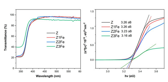 Figure 7a shows spectra of UV and visible transmittance of the films on glass substrates. It can be seen from the data that all films have a high transmittance in the visible range. The transmittance of Z and Z1Fe films ranges from 87 to 97% of visible light, Z1Fe—90–97%, and Z3Fe has the lowest transmittance in the visible range (90–92%), probably due to the dense coating of ZnO surface with Fe2O3 nanoparticles. The edge of the fundamental absorption band of the films corresponds to the transition of the electron from the valence band to the conduction band, and it can be used to calculate the optical band gap width. The optical band gap width was determined by plotting the Tauc plot (Figure 7b) [55]. The Eg values of ZnO/Fe2O3 films calculated by this method are 3.26, 3.26, 3.23, and 3.16 eV for samples Z, Z1Fe, Z2Fe, and Z3Fe, respectively. The narrowing of the band gap width can be explained by the strength of ionic bonding between metal ions and oxygen ions. The electronegativity values of Zn, Fe, and O are 1.5, 1.8, and 3.5, respectively [56], so the difference in energy levels between the s-state cation and the O 2p state in α-Fe2O3 is smaller than in ZnO. This testifies to the fact that the red shift of the absorption edge occurs mainly due to the formation of Fe s-levels below the conduction zone of ZnO [57].