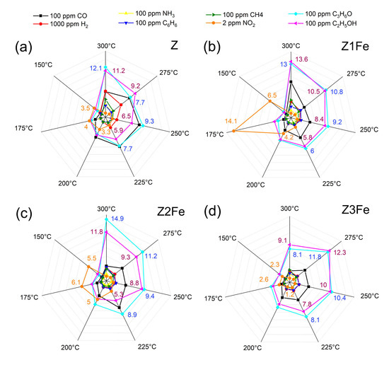 Selectivity diagrams responses to various gases (H2, CH4, CO, C6H6, NH3, ethanol, acetone, and NO2) at 150–300 °C of the samples: (a) Z, (b) Z1Fe, (c) Z2Fe, and (d) Z3Fe.