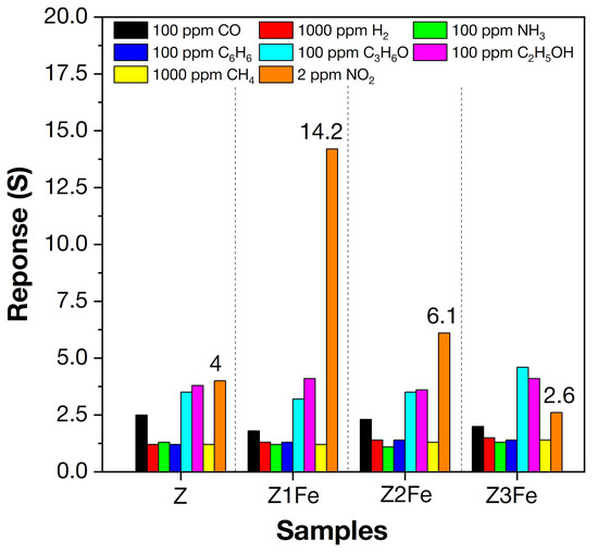 Figure 10a shows the experimental data on the sensitivity to different NO2 concentrations of Z, Z1Fe, Z2Fe, and Z3Fe samples. The zinc oxide-based films show a high response in a wide range of ultra-low NO2 concentrations (300–2000 ppb), covering the threshold limit value (TLV) recommended by the National Institute for Occupational Safety and Health [60]. The response increases from 1.3 to 4.0, 4.0–14.2, 1.9–6.1, and 1.3–2.6 with increasing NO2 concentrations from 300 to 2000 ppb for Z, Z1Fe, Z2Fe, and Z3Fe, respectively.