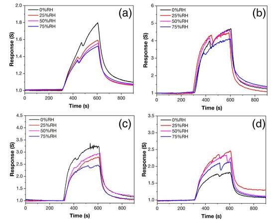 Response to 500 ppb NO2 at 175 °C and 0–75% RH of ZnO/Fe2O3 thin films: Z (a), Z1Fe (b), Z2Fe (c), and Z3Fe (d).
