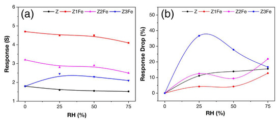 Figure 12a summarizes the data on the effect of humidity on the response value of the obtained thin films. For samples Z, Z1Fe, and Z2Fe, the response dependence on RH can be described by the curve with a negative slope. The sample Z3Fe showed an increase in the response at 25% RH, and then a consistent decrease in its value was observed. Figure 12b shows the modulus of change in the response value relative to its value in dry air. As can be seen, the sample Z1Fe is the least affected by humidity among the samples, and the sample Z3Fe has the maximum sensitivity to humidity.