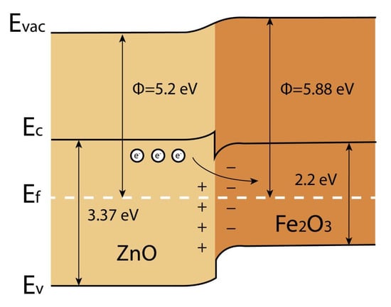 Energy diagram of heterojunction formation between ZnO and Fe2O3 in ZnO/Fe2O3 thin films.