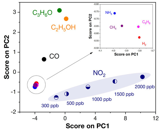 Additionally, to enable selective signal separation, we used principal component analysis (PCA) to evaluate the correlation between the response of the four receptor nanomaterials used (Z, Z1Fe, Z2Fe and Z3Fe) and selectivity. Chemometric analysis is quite common in multisensor and E-nose systems for the detection of a wide group of analyte gases, including medical applications. Figure 14 shows the data obtained after mathematical processing of the PCA responses using the covariance matrix. As can be seen, the resulting graph consists of several distant clusters: 300–2000 ppb NO2, 100 ppm C2H5OH, C3H6O, and CO, and 1000 ppm CH4, H2, 100 ppm C6H6, and NH3 (inset), which allows their concentrations to be determined with high accuracy. Thus, using a sensor array consisting of four thin-film ZnO/Fe2O3 nanocomposites, signals can be separated with great selectivity when detecting the eight diverse analyte gases used in this work. Such results are extremely important in the transition to multisensor devices that are used for noninvasive disease diagnosis, where it is necessary to analyze a wide group of gases contained in human exhaled air.