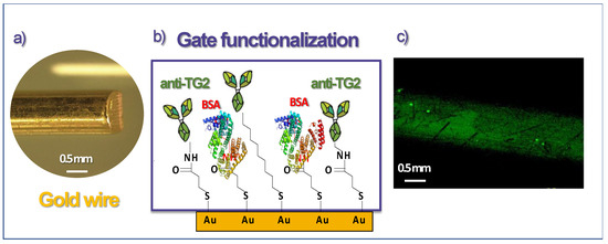 The protocol consists of the following steps: first of all, the gold wires (purity: 99.99%, purchased by Franco Corradi sas) with a diameter of 1 mm (Figure 1a) were properly cleaned in acetone and isopropanol for 10 min each in an ultrasonic bath. Once cleaned, they were immersed in a pure ethanol solution containing 10 mM thiols (3-MPA and 11-MUA in 10: 1 molar ratio) for 24 h, after which they were washed several times in ethanol and deionized water and dried under air flow. This step allows the formation of a layer on the gold surface known as SAM (self-assembled monolayer) [34,35], with a carboxylic group (COOH) at one end and a thiol group (SH) at the other end, the latter being able to bind covalently to gold [36]. Then, the gold wires were immersed in an aqueous solution containing 1-Ethyl-3-(3-dimethylaminopropyl)carbodiimide (EDC) at 200 mM and N-hydroxysulfosuccinimide (sulfo-NHS) at 50 mM for 2 h at 25 °C, after which they were washed with High Performance Liquid Chromatography (HPLC) water, which is an ultrapure water with low level of ions and less impurities than deionized water. This reaction produces the activation of the terminal carboxyl groups of each thiol through the formation of amide bonds between the aforementioned COOH groups and the amino functions of the EDC. Such a step allows the formation of hydrogen bonds inside the thiol layer, with the consequent achievement of a dense electrostatic network; the system thus formed is called chem-SAM. The gold electrodes were then immersed in 100 μL of 10 mM PBS at pH = 7.4 containing the antibodies of interest (100 μg/mL of anti-TG2) for one hour, after which they were first rinsed with PBS solution containing 0.1% Tween 20, a detergent commonly used to improve the removing action of any impurities, and finally with PBS only. The antibody functionalization of the gate electrodes makes the final device selective towards a very specific target molecule (in our case, TG2) [37,38]. Subsequently, the gates were immersed in a 1 M solution of ethanolamine in 10 mM PBS for 1 h at 25 °C, then washed with deionized water. The addition of ethanolamine to the system serves to block the activated carboxyl groups not bound to any antibody. Finally, the gold wires were immersed in a 1.5 μM solution of bovine serum albumin (BSA) in 10 mM PBS for 1 h at 25 °C in order to further minimize any non-specific bond; it has been shown in previous studies, indeed, that the presence of BSA increases the quality of detection by significantly lowering the so-called Limit of Detection [27]. The system thus formed, placed immediately above the chem-SAM, takes the name bio-SAM (Figure 1b).