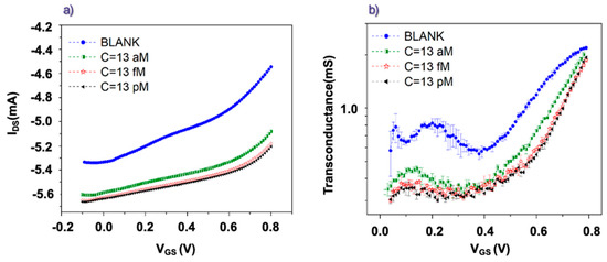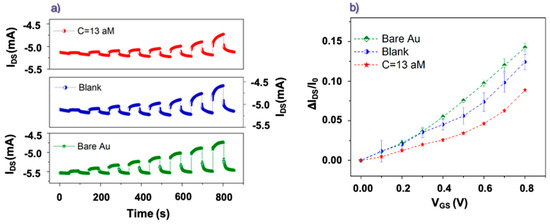 Figure 2a reports some pulse measurements achieved while OECTs were driven by differently functionalized gate electrodes. Here, VGS was increased from 0 V to 0.8 V (a step of 0.1 V), while VDS was kept constant at −0.1 V. In this case, the response obtained with a pristine (bare) gate Au electrode was compared with those recorded using the same electrode, once functionalized with anti-TG2 antibody, before (blank) and after the incubation in solution with an attomolar (13 aM) concentration of rhTG2 protein. All the curves in Figure 2a confirm clearly the proper operation of the considered PEDOT:PSS-based OECT as depletion-mode transistors [39] since a decrease (in absolute value) of the IDS current upon the application of positive VGS voltages can be observed. As aforementioned, this occurrence is related to the electronic de-doping action carried out by the cationic species (namely, Na+ and K+ given the use of PBS as an electrolyte) penetrating in the PEDOT: PSS channel.
