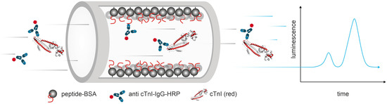 Miniaturization is a significant advantage compared to more complex and expensive large-scale devices [24]. Furthermore, this sensor allows quasi-continuous measurements where, compared to SPR, no intermediate rinsing or regeneration steps are necessary after each sample [21]. Proven cTnI-specific antibodies [25,26] labeled with horseradish peroxidase are mixed with the sample. The mixture is then passed over an affinity column consisting of a borosilicate glass monolith functionalized with a surrogate peptide of the cTnI epitope against which the antibody is directed. Samples containing cTnI block the specific binding site of the antibody, which prevents the conjugate from binding to the peptide column and immediately passes through the detector. Subsequent light emission is caused by the enzymatic reaction of the substrate. If no analyte is present in the sample, the labeled antibody is quantitatively captured on the peptide column. Since the assay mechanism is dependent on the slow off-rate of the antibody–analyte complex, some specific consequences arise. In the optimal case, the antigen–antibody complex passes the column without dissociation. Therefore, a high excess of antibody conjugate can be used, which enhances the formation of antibody–analyte complexes, a strict prerequisite for any immunochemical technique.