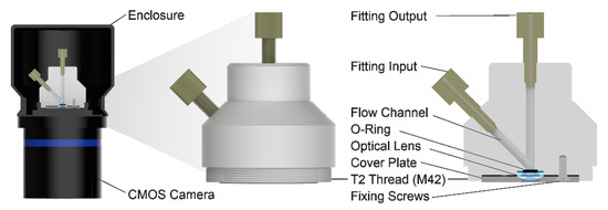 The flow cell was designed, and precision manufactured in-house and consisted of POM; see Figure 3. The cover plate and the enclosure were additively manufactured and consisted of acrylonitrile butadiene styrene (ABS), retaining the planoconvex lens (12 mm focal length) with a diameter of 9 mm via O-ring. Both were mounted and sealed with five DIN 7991—M3x8 screws.