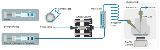 Initially, for equilibration and to remove all air bubbles inside the tubing and the flow cell, the whole microfluidic setup was flushed with filtered (0.2 µm) and degassed running buffer (PBS with 0.05% Tween 20 and 0.1% BSA). Subsequently, the running buffer and chemiluminescence substrate were injected with a high-precision dual syringe pump. The buffer flow was directed through a six-way valve, which was used to inject 500 µL samples via a sample loop to the monolithic affinity column (see Figure 4). After passing the monolithic column, the chemiluminescence substrate was blended with the sample flow with a microfluidic pearl-chain mixer, as shown in Figure S9. In this process, the sample flow was mixed 1:1 with the chemiluminescence substrate and incubated for around 11 min in an incubation loop. The chemiluminescence signal was detected via a CMOS sensor connected to the flow cell. The exit flow was collected in a waste beaker and discarded.