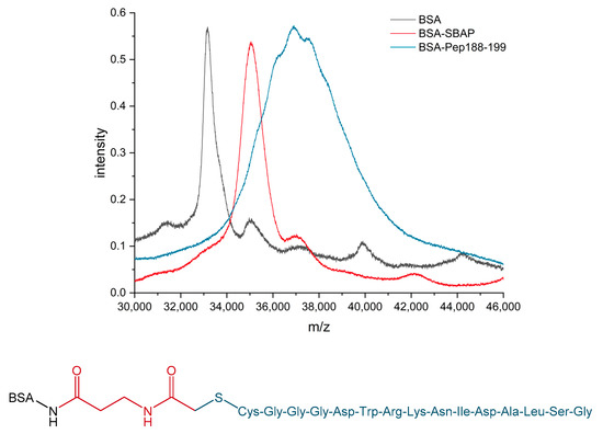 MALDI-TOF-MS of doubly charged species [M+H]2+ of BSA (black), BSA-SBAP (red), and final Pep188-199-SBAP-BSA conjugate (blue). For the coupling density of the final BSA–peptide conjugate, the spectrum was fitted non-linearly with a Lorentz-fit and Levenberg Marquardt iteration algorithm (fit not shown), and the peak maximum was used for the calculation. Below, a schematic structure of the conjugate is shown. The C-terminus of the peptide is amidated. Due to the shift in the spectrum towards the higher mass range, an average of about five peptides per BSA could be calculated.
