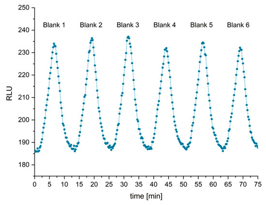 The signal difference provides information about the completeness of the antibody binding with the affinity column. By inserting the affinity column, the signal was reduced by 94%, which means that this fraction of the antibody–HRP conjugate was bound to the peptide–BSA column. Six percent of the conjugate was not trapped, which might have been caused by inactive bioconjugates, non-conjugated HRP, or kinetic limitations. This fraction might be further reduced, e.g., by additional purification steps or lower flow rates. Subsequently, the antibody–HRP conjugate was injected six times into the column, shown in Figure 8. A stable baseline was obtained, and the peak area of each blank was integrated, resulting in a relative standard deviation of 4.4%.