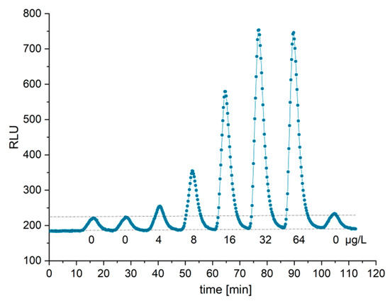 The performance of the functionalized peptide–BSA affinity column and the 9707–HRP conjugate were tested by the injection of the highly diluted reagent (1:60,000). In addition, the relative chemiluminescence intensity was measured with and without an inserted affinity column, as shown in Figure 7.