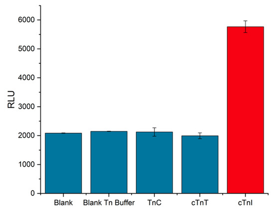 Antibody specificity test against cTnI: The biosensor detected cTnI (red column). No cross-reactivity with cTnT, cTnC, or any influence of the sample buffer was observed at 16 µg/L. Chemiluminescence was quantified by integration of the peak area. Error bars represent one standard deviation.