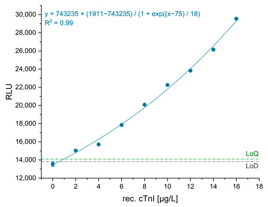 The LoD and the LoQ of the biosensor were investigated in more detail. Therefore, various concentrations of cTnI were measured in a series, ranging from 0 to 16 µg/L, as shown in Figure 11. From this calibration curve, an LoD of 0.6 µg/L (3s) and an LoQ of 1.0 µg/L (6s) could be calculated.