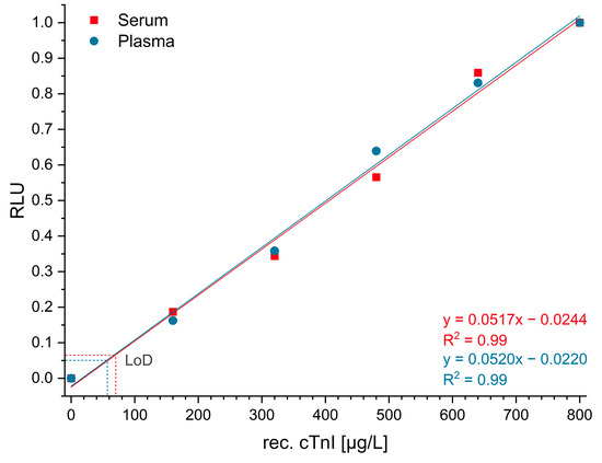 The calibration lines for cTnI in serum and plasma are shown in Figure 13. With a dilution of 1:40, no concentration-dependent matrix effects were observed. The experiment covered a range between 0 and 800 µg/L of spiked recombinant cTnI. LoDs of 70 µg/L for serum and 60 µg/L for plasma were calculated based on the standard deviations of the blank values of each dilution series, including the 40-fold dilution factor.