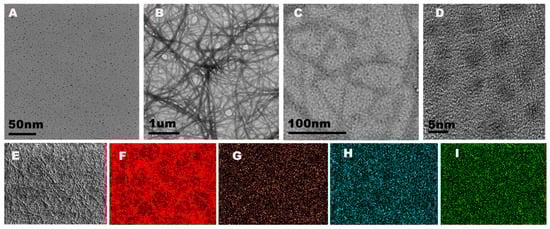 (A) TEM image of NCDs; (B) TEM image of Ir–NCDs; (C,D) magnified topography of Ir–NCDs at different magnifications; (E) original image of mapping characterization of Ir–NCDs; and (F–I) elemental distribution of Ir, C, N, and O, respectively.