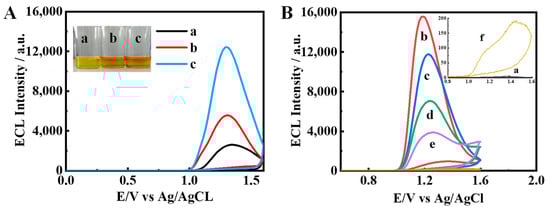 Comparison of ECL signals of (A) a: Ir complexes monomer (black), b: Ir/NCDs (red), and c: Ir–NCDs (blue); and (B) a: bare GCE; b: Ir–NCDs/PDDA; c: Ir–NCDs/PDDA/GA; d: Ir–NCDs/PDDA/GA/Ab; e: Ir–NCDs/PDDA/GA/Ab/BSA; f: Ir–NCDs/PDDA/GA/Ab/BSA/SE.