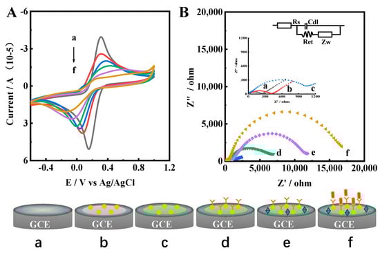 (A) CV and (B) EIS curves of a: bare GEC; b: Ir–NCDs/PDDA; c: Ir–NCDs/PDDA/GA; d: Ir–NCDs/PDDA/GA/Ab; e: Ir–NCDs/PDDA/GA/Ab/BSA; and f: Ir–NCDs/PDDA/GA/Ab/BSA/SE. The EIS spectra were obtained with a 5 mM [Fe(CN)6]3−/4− solution using a frequency range of 0.1 MHZ–0.1 Hz, a bias potential of 0.225 V and an AC amplitude of 5 mV.