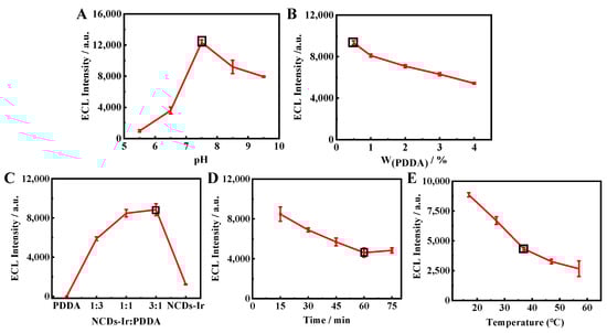 To obtain the best performance of the immunosensor, the pH of PBS, scan rate, amount of PDDA and ratio of the nanowires and PDDA, reaction time, and temperature were optimized. The corresponding results are shown in Figure 4. Firstly, the pH of PBS (0.10 M) was optimized. An increasing ECL signal from the Ir–NCDs nanowires was observed with the pH increasing from 5.0–7.5. When the pH surpassed 7.5, the ECL signal dropped gradually. Therefore, pH 7.5 was chosen as the optimal pH.