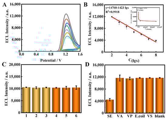 Based on the optimum conditions, the analytical performance of the immunosensor for detecting SE with various concentrations was investigated. As shown in Figure 5A, with the increase in SE concentration, the ECL from the Ir–NCDs at the electrode surface decreased, resulting in a quenching of the ECL signal. Figure 5B shows the linear relationship between the concentration of SE and the ECL intensity. The linear fitting equation was y = 14,760–1423 lgC, with a detection limit of 1 × 102 CFU/mL (S/N = 3). Additionally, the LOD and linear range of detecting SE in this work was compared with various methods reported in the literature (Table S1), confirming that the proposed method showed higher sensitivity than other methods, with an excellent detection range.