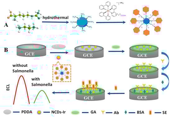 The glassy carbon electrode was polished in turn with 0.3 μM and 0.05 μM alumina slurries, and then rinsed sequentially with ultrapure water, ethanol and acetone followed by ultrasonication before use. Then GCE electrodes were activated and further cleaned in 0.5 mol/L H2SO4 solution by CV (scanning from 1.0~−1.0 V) until an ideal voltammogram was obtained (no further change in background current). To construct the sensor, Ir–NCDs and PDDA (1:1) were mixed and sonicated for 30 min, and then 10 μL of the mixed solution was drop-coated on the glassy carbon electrode. PDDA is a polyelectrolyte and acts to increase the stability of the Ir–NCDs, while its conductive property enhances the electron transport to the modified electrode. The electrode was then drop-coated with 10 μL of GA, which acts as an intermediate linker between the Ir–NCDs and the antibodies. Subsequentially, 5 μL of antibody solution was drop-coated on the GCE surface and reacted overnight in a refrigerator at 4 °C. Finally, 10 μL of BSA was dropped on the electrode surface to react for 2 h, blocking the unbound sites. Before analysis, different concentrations of salmonella were incubated with the modified electrode for 1 h.