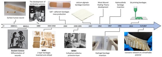 The development of bandages through time and major milestones throughout the last five millennia. Most of the advancements were achieved in the 20th century, particularly during the wars of the era. The adherence to skin tissue was the catalyst of using a two-layer structure [12,13,14], and the industrial revolution introduced mass production to the field. Earliest human record [15], ancient Greece [16], sterilization [17], WWI image [18], WWII image [19] Reproduced under the CC_BY license, Hydrogel Reprinted with permission from Heliyon, Copyright 2020, Elsevier [20], 3d printing Reprinted from “3D printing nozzle (multilayered)”, by BioRender.com (2023) Retrieved from https://app.biorender.com/biorender-templates, accessed on 9 March 2023. Future Reprinted with permission from Materials Today, Copyright 2022, Elsevier [21].