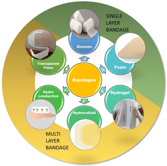 Conventional bandages can be divided into single or multilayer designs and categorized into six different types, as shown in Figure 4: gauzes, foam, hydrogel, hydrocolloid, hydro-conductive and transparent nanofibrous films.