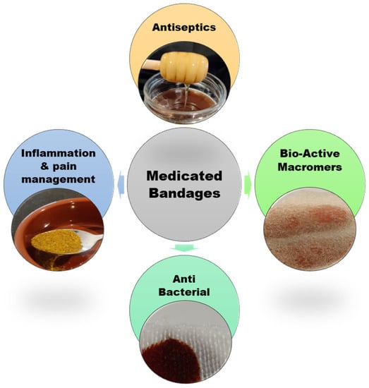Four main types of medicated bandages: 1. Bio-Active Macromers: Actively enhance tissue regeneration by using natural and synthetic materials, (alginate, collagen, chitosan and PU-based polymers) [84,85], 2. Antiseptic: natural agents such as manuka honey and charcoal, and synthetics such as polyhexanide (PHMB) [86] 3. Anti-Bacterial agents such as silver, iodine and antibiotics. 4. Inflammation and pain management: drugs such as ibuprofen, lidocaine and more [87].