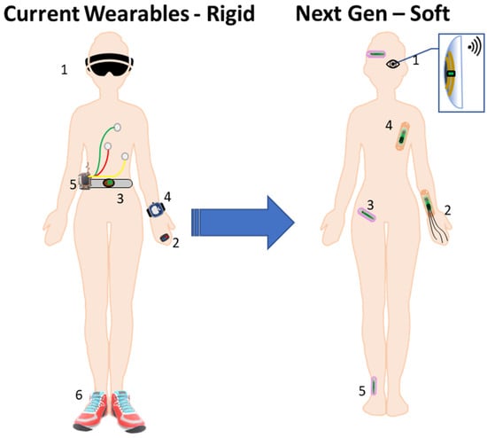 The wearable market has grown significantly in recent years, and revolves mainly around the private consumer sector; in 2022, it reached a value of USD 61.4 billion [88]. The majority of wearables available today can be classified in four main groups: head-mounted, body-worn, lower body devices and wrist-worn or hand-held devices [1]. They can be described as mainly fashion items with limited sensory capability, where smartwatches, wristbands, rings, belts, and headbands are examples. Most current-generation devices have the same problem of being rigid and planar in comparison to human skin, which is soft and curvilinear [89]. These available wearable devices are mainly used for measurements of simple parameters such as heart rate [90]. Their accuracy has improved dramatically in the last couple of years, and the latest version of the Apple Watch offers electrocardiogram (ECG) recording capability that has been approved by the US Federal Drug Administration (FDA). Even so, the most advanced products available on the market still fail to continuously monitor basic vital signs during daily activity [91], mostly as a result of motion artifacts that originate from loose attachment to the skin [92]. These limitations remain the fundamental constraints on their measurement capacity, and hinder their accuracy and introduction into the healthcare system.